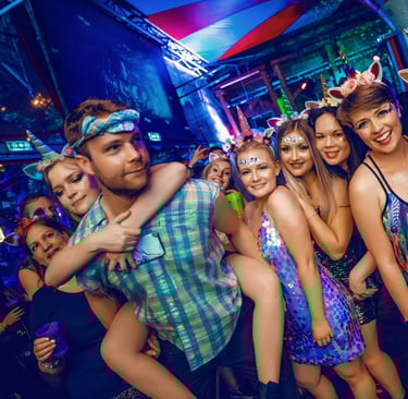 Across the complex, drink service is optimized for speed and convenience. With 18 bars scattered throughout, queues seldom bottleneck, even at peak hours. Drinks are served in reusable plastic cups with a token-and-deposit system: patrons pay a small refundable deposit for a cup and a token, keeping queues moving and reducing waste. The bar staff are efficient and often multilingual. While drinks are priced slightly above average, the quality and variety—spritzers, cocktails, local beers, spirits—match the venue’s energetic vibe. Food is available from minimal snack stations and external pop-ups, though it is not a highlight; the focus remains squarely on the party experience and fluid logistics between zones.